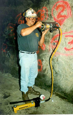 Miner operating the hydraulic jack to pull-test the bolt. Engineer is reading the gauge mounted on the hydraulic jack. Jack Weight 6 kg (13.5 lbs)